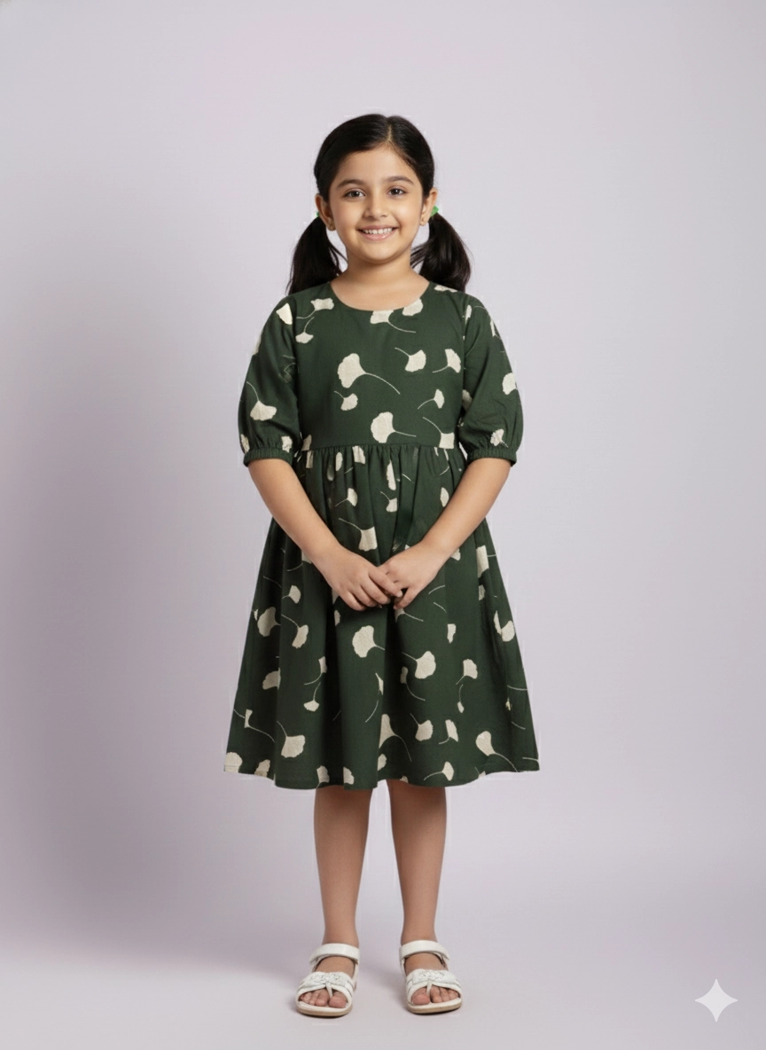 This delightful olive green dress is perfect for any young fashionista. Featuring a playful white floral pattern, it offers a comfortable fit with its soft, breathable fabric. The dress has a round neckline and puffed sleeves that add a touch of elegance, making it suitable for both casual outings and special occasions. The knee-length design ensures ease of movement, while the elastic waist provides a snug fit. Ideal for spring and summer wear, this dress combines style and comfort effortlessly.