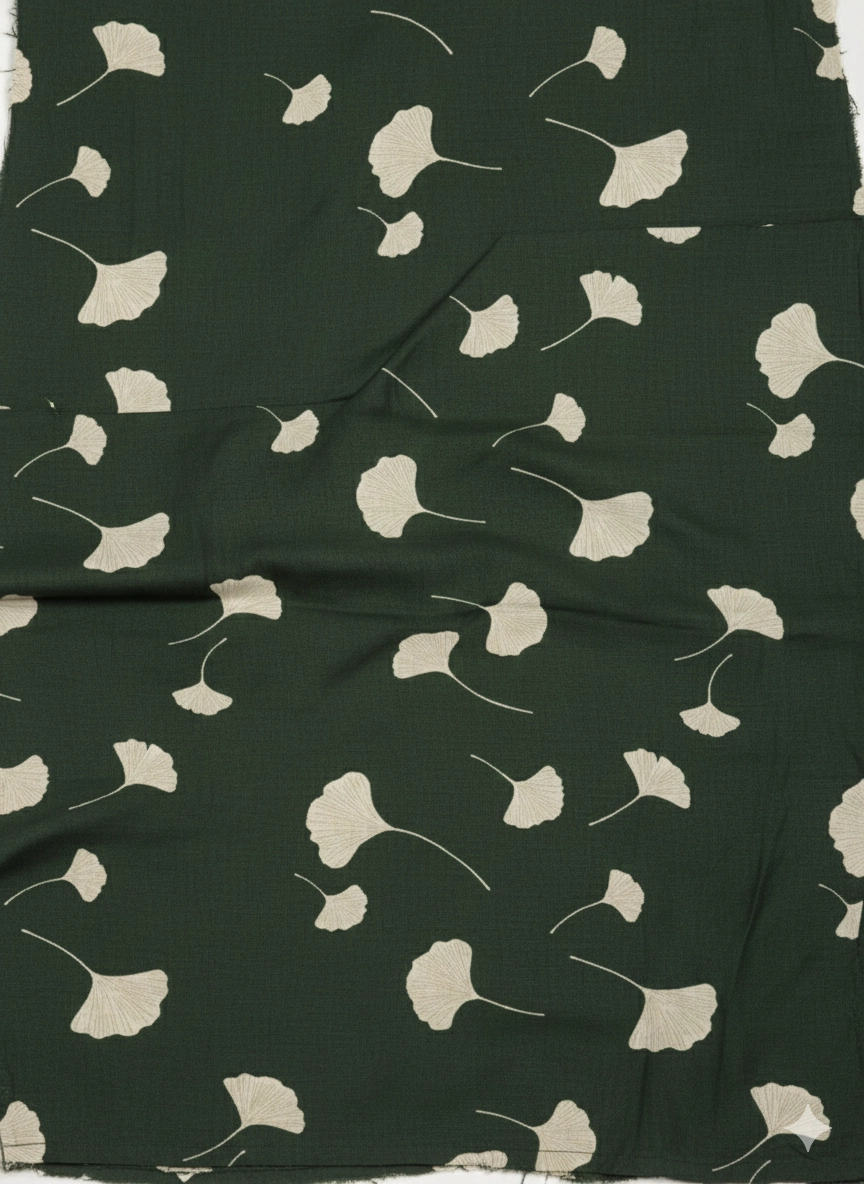 This elegant fabric features a sophisticated ginkgo leaf pattern set against a rich, dark green background. Perfect for creating stylish apparel, home decor, or crafting projects, this fabric offers a blend of beauty and versatility. The high-quality material provides durability and a smooth texture, ensuring comfort and long-lasting use. Ideal for those looking to add a touch of nature-inspired design to their creations.